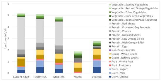 Our results show that the omnivore dietary patterns (which include foods such as beef, pork, goat, poultry, fish, eggs, cow milk and cheese) require more land use than those that include only plant-based foods (such as fruits and vegetables, and soy milk). The Current U.S. and the Healthy U.S. dietary patterns are very closely associated with the most land use per day (5.17 m2 and 5.12 m2, respectfully) with the Healthy Mediterranean dietary pattern using slightly less land (4.88 m2) (Figure 1). The major contributor to land use in these dietary patterns is the red meat food group (2.08–2.81 m2). The amount of land used to produce red meat for each of the three omnivore diets is greater than the total amount (1.82 m2) of the lowest land-using dietary pattern (Vegan). Other significant food group contributors to land use in the omnivore diets examined are the dairy categories, specifically milk (0.26–0.55 m2) and cheese (0.26–0.55 m2); and grains, both refined (0.35–0.68 m2) and whole (0.13–0.45 m2). The U.S. Current diet is characterized by higher refined grained consumption therefore refined grains contribute more to land use in this dietary pattern. For the Vegan diet, refined (0.35 m2) and whole grains (0.45 m2) contribute the most to land use.