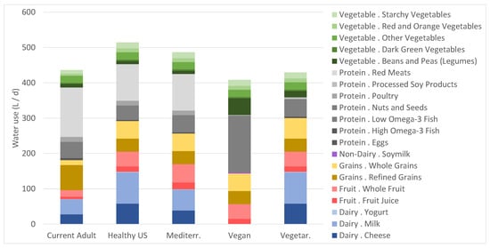 On-farm water use requirements for five diets reflecting an average of 2000 kcalories (recommended diets) or 2155 calories (Current diet), with major food group (dairy, fruit, grains, non-dairy, protein, and vegetable) and subgroups indicated by column colors.