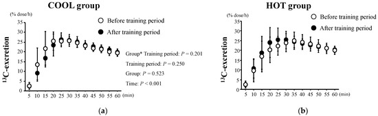 13C-excretion after HST before and after the training period in both COOL (a) and HOT groups (b). Values are means ± SD. *: Significant main effect of training.