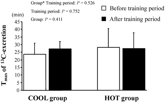 The changes in 13C-excretion levels are shown in Figure 3. These did not change during the tests in either group (p = 0.250) and there was no significant main effect of group (p = 0.523) and no interaction between training period and group (p = 0.201). As shown in Figure 4, there were no significant differences in Tmax between the groups before training (p = 0.411). We found neither a significant main effect of training (p = 0.752) nor an interaction of training × group (p = 0.526).