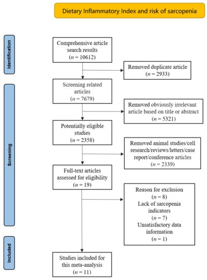 The inclusion criteria were as follows: (1) the study design was observational studies; (2) the DII was obtained based on a standard calculation method; (3) sarcopenia was defined by local criterion; (4) the literature was based on human subjects; (5) the primary outcomes of interest were presented as odds ratios (ORs) or relative risks (RRs), along with their 95% confidence intervals (CIs), or comprehensive data were provided to calculate them; and (6) duplicate articles, reviews, or conference papers were excluded. Two researchers independently evaluated all of the relevant papers, extracted the final eligible literature, discussed and resolved disagreements with experts in the field (Figure 1).