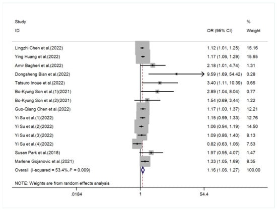 Forest plot of the risk of sarcopenia in subjects with a high DII vs. a low DII [,,,,,,,,,,].