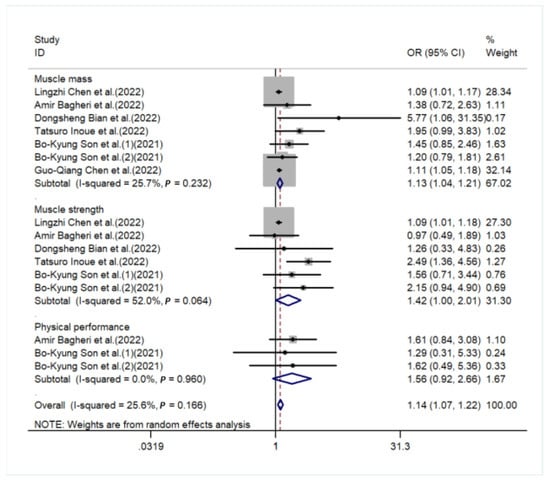 Forest plot for the subgroup of performance of sarcopenia [,,,,,].