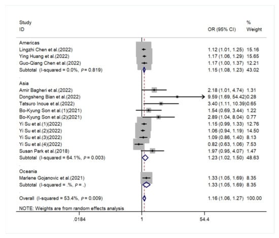 Forest plot for the subgroup of region [,,,,,,,,,,].