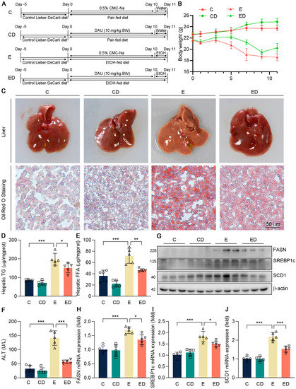 Mice were treated with a short−term chronic (10 days)−plus−binge ethanol feeding model to induce ALD, according to the National Institute on Alcohol Abuse and Alcoholism (NIAAA) protocol [17]. Firstly, the Lieber−DeCarli diet was given to all mice for 5 days to acclimate to a lipid diet. After that, mice were provided sustained feeding with the Lieber−DeCarli diet containing 5% (vol/vol) ethanol for 10 days. 9 h before euthanizing, the mice were given ethanol (5 g/kg body weight) intragastrically. Control groups were fed a control diet with the same calories. Four groups of mice were set up (n = 8 in each group) in our experiment: control group (C), DAU group (CD), EtOH group (E), and EtOH plus DAU group (ED) (Figure 1A). The mice in CD and ED were administered intragastrically with DAU (10 mg/kg body weight) for 10 days.