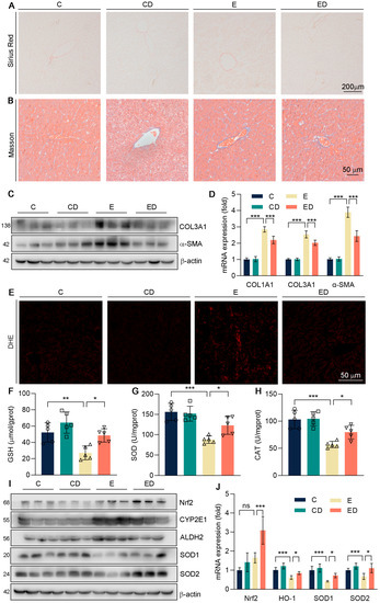 The effect of DAU on hepatic oxidative stress induced by alcohol. (A) Hepatic Picrosirius Red staining of mice. (B) Hepatic Masson staining of mice. (C,D) Protein and mRNA expression of COL1A1, COL3A1, and α−SMA in mice liver. (E) Hepatic DHE staining of mice. (F–H) Hepatic GSH, SOD, and CAT levels. (I) Protein expression of Nrf2, CYP2E1, ALDH2, SOD1, and SOD2 in mice liver. (J) mRNA expression of Nrf2, HO−1, SOD1, and SOD2 in mice liver. Data are mean ± SD using one−way ANOVA (n ≥ 3), * p < 0.05, ** p < 0.01, *** p < 0.001, ns: not significant.