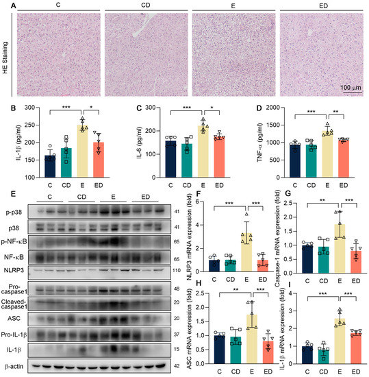 Studies have shown that ALD can be alleviated by regulating the p38 pathway [32]. To further explore the mechanism of DAU in ameliorating liver inflammation, phosphorylation of p38 and NF−κB, and the activation of NLRP3 inflammasome were detected (Figure 3E–I and Figure S3). It showed that DAU decreased the phosphorylation levels of p38 and NF−κB in contrast to the E group. At the same time, the expression of NLRP3, cleaved−caspase−1, ASC, and IL−1β was also downregulated by DAU. The above results suggest that DAU may ameliorate alcohol−induced hepatic inflammation by regulating inflammasome activation through p38/NF−κB pathways.