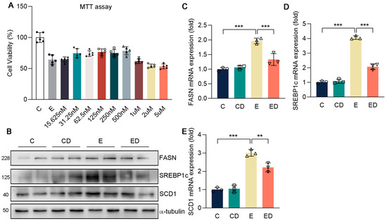 First of all, the appropriate concentration of DAU on HepG2 in vitro was determined by MTT assay (Figure 4A). It showed that alcohol inhibited cell viability, while the DAU of 31.25–500 nM could slightly alleviate the decrease of cell viability caused by alcohol. We chose the concentration with 500 nM of DAU for the subsequent experiments. Previous in vivo studies have shown that DAU can alleviate liver fibrosis and lipid accumulation in mice liver. Therefore, HepG2 cells were applied for verification in vitro, and the results were consistent with the results in vivo. Briefly, alcohol promoted FASN, SREBP1c, and SCD1 expression in lipid synthesis. However, after DAU treatment, these changes were reversed (Figure 4B–E and Figure S4). Combined with the in vivo and in vitro study, we confirmed that DAU can alleviate liver lipid accumulation.