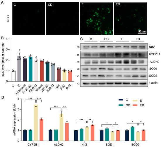 Next, we conducted DCFH−DA staining in HepG2. In Figure 5A, DAU had an obvious inhibitory effect on oxidative stress caused by alcohol. In addition, in Figure 5B, the ROS levels of HepG2 were detected under the same concentration of alcohol and DAU with MTT assay. We chose 500 nM of DAU for the subsequent experiments. It showed that ALDH2 and CYP2E1 expression were increased in HepG2 due to alcohol and were downregulated by DAU (Figure 5C and Figure S5). In addition, compared with the E group, the expression of antioxidative genes in the ED group was significantly increased by DAU (Figure 5D). These results suggest that DAU can alleviate the rate of alcohol metabolism and avoid acute oxidative injury caused by excessive alcohol metabolism.