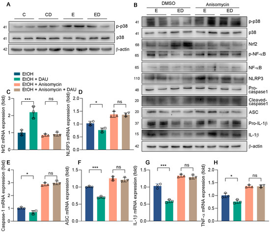 The effect of anisomycin in DAU ameliorated liver inflammation induced by alcohol. (A,B) Protein expression of p−p38, p38, p−STAT3, STAT3, p−NF−κB, NF−κB, NLRP3, pro−caspase−1, cleaved−caspase1, ASC, pro−IL−1β and IL−1β in HepG2. (C–H) mRNA expression of Nrf2, NLRP3, caspase−1, ASC, IL−1β and TNF−α in HepG2. Data are mean ± SD using one−way ANOVA (n ≥ 3), * p < 0.05, *** p < 0.001, ns: not significant.
