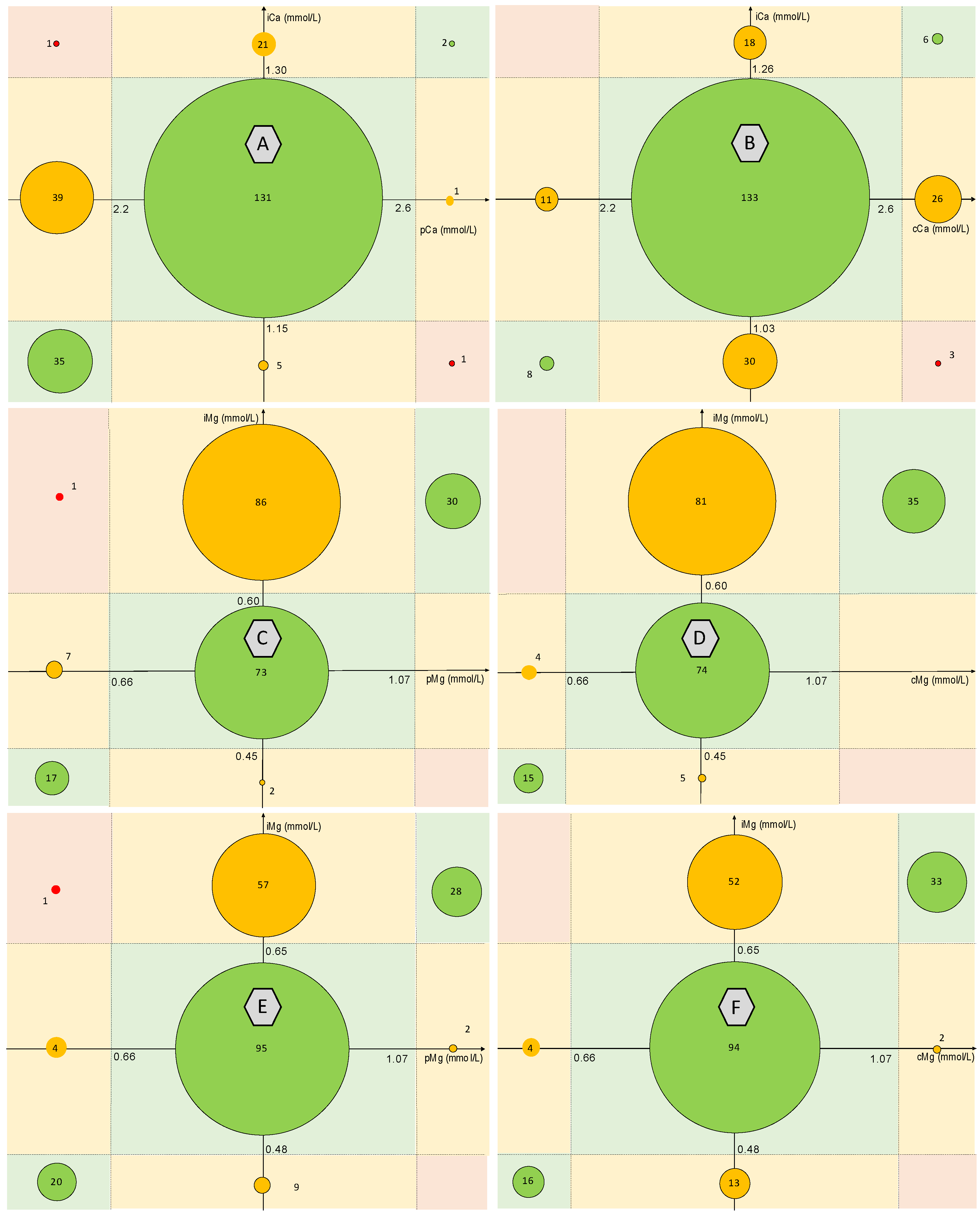 | Manufacturer’s range of iMg (mmol/L) | <0.45 | 20 (8.5) | 15 (7.6) | 0.93 | 11 (10.5) | 14 (11.9) | 0.93 | 9 (6.9) | 1 (1.3) | 0.09 |