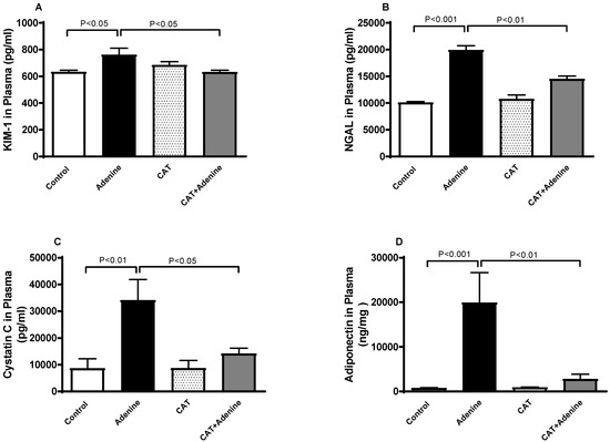 Markers customarily used to detect kidney injuries associated with CKD, such as KIM-1, NGAL, cystatin C and adiponectin were also assessed in our study [8,49,50]. These biomarkers of reduced renal function were found to be significantly elevated in adenine-treated mice, which is in line with previous reports [51,52,53] and were reduced markedly when treatment with CAT was given concomitantly with adenine.