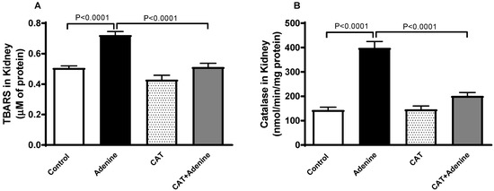 The concentration of TBARS, a marker of lipid peroxidation, was significantly elevated in the adenine group (p < 0.0001) when compared with the control group. This elevation was significantly reduced when treatment with CAT was administered concurrently (p < 0.0001). Similarly, a significant surge was documented in catalase activity in adenine-treated mice compared to the control (p < 0.0001). This effect was markedly reduced (p < 0.0001) with CAT pretreatment (Figure 2).