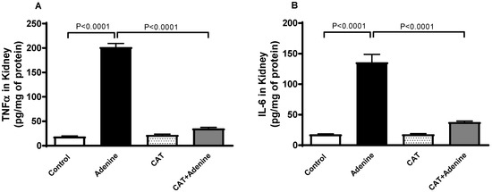 Adenine-treated mice demonstrated a significant elevation in the kidney concentrations of proinflammatory markers TNFα and IL-6 compared to the control mice (p < 0.0001 and p < 0.0001, respectively, Figure 3). However, these elevations were significantly mitigated when CAT was given alongside adenine (p < 0.0001 and p < 0.0001).