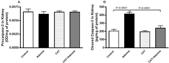 Figure 5 shows that while the level of procaspase 3 was slightly but statistically insignificantly decreased, the level of cleaved caspase-3 in the kidney was significantly higher in the adenine group compared with the control group (p < 0.0001) and this increase was significantly diminished in mice treated with both adenine and CAT (p < 0.0001).