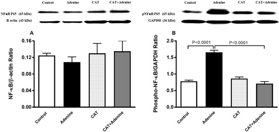 Figure 6 shows that treatment with adenine induced an insignificant reduction in the expression of NF-κB. Nevertheless, a notable and statistically significant surge in the expression of phospho-NF-κB in the kidney homogenate was observed in the adenine group compared with the control group (p < 0.0001, Figure 6). This surge was significantly prevented by treatment with CAT (p < 0.0001).