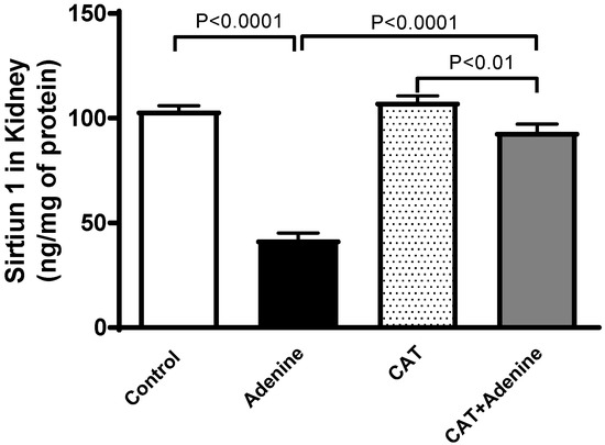 Figure 7 depicts that the level of sirtuin-1 was significantly reduced in the adenine group compared to the control (p < 0.0001). This reduction, however, was significantly prevented in mice treated with both CAT and adenine when compared with the adenine-only group (p < 0.0001).