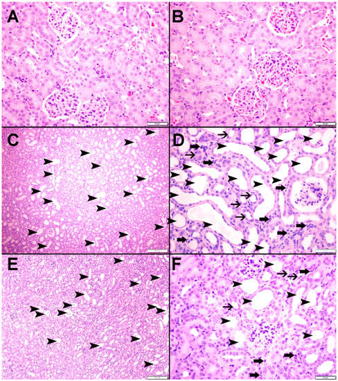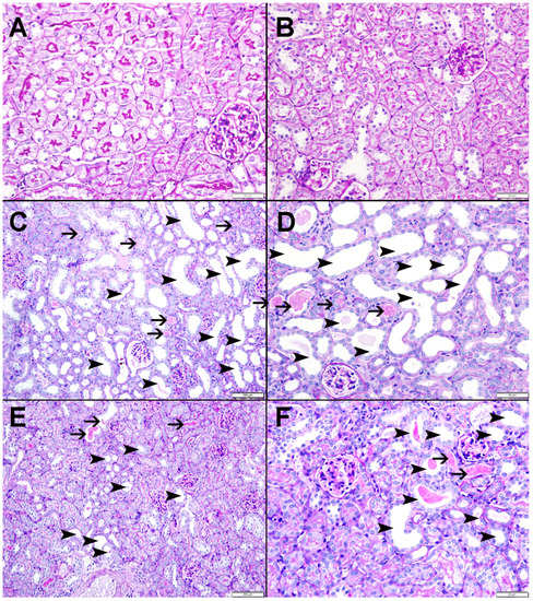 Representative images of periodic acid-Schiff (PAS) staining of kidney tissue of mice with or without adenine (0.2% w/w, for 4 weeks) added to the feed and oral treatment of saline or catalpol (CAT, 5 mg/kg) for 4 weeks, except during the weekends. The Control (A) and CAT-treated (B) groups showed normal kidney architecture and histology. The adenine-treated group (C,D) shows large areas of dilated tubules (arrowheads) and foci of acute tubular necrosis (thin arrows). The CAT + adenine group (E,F) showed a significant ameliorative effect with a reduction of foci of both dilated tubules (arrowheads) and acute tubular necrosis (thin arrows).