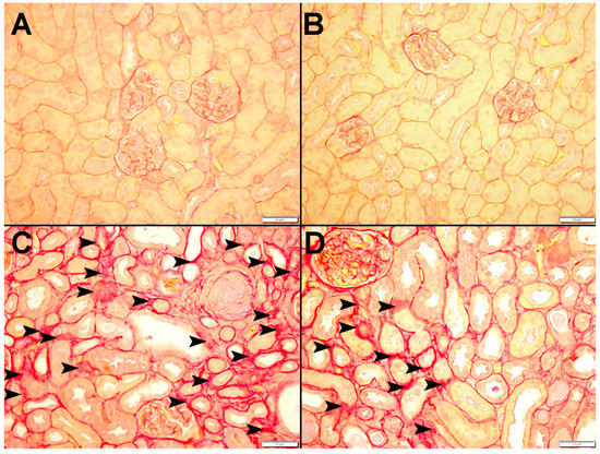As per the standard histological protocol, the samples (n = 6 in each group) were fixed, grossed, processed and embedded in paraffin [31]. Then, they were sectioned into 4 µm pieces using a microtome from Leica Biosystems (Nussloch, Germany) and mounted onto slides. The slides were stained with hematoxylin and eosin (H&E) to assess acute tubular necrosis, Sirius red stain to evaluate interstitial fibrosis, and periodic acid Schiff (PAS) stain to assess the glomerular integrity [32,33]. The stained sections were blindly evaluated under a light microscope by a pathologist. The scoring was performed semi-quantitatively based on the percentage of renal tubular necrosis. A score of 0 was given to a slide that exhibited normal kidney architecture with no tubular injury, a score of 1 for tissues that had less than 25% tubular injury, 2 for tissues with tubular injury of 26–50%, 3 for 51–75%, and a score of 4 was given to tissues with more than 75% of necrotic tubular injury. The proportion of red-stained fibrotic area in the cortex of each section, stained with Sirius red stain, was graded semi-quantitatively and the fibrosis index was calculated and expressed in percentage according to the protocol previously reported [32,34].