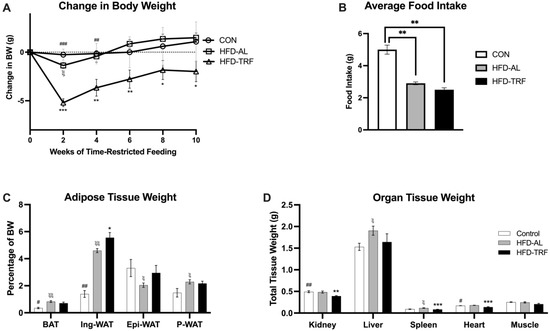 Body weight, food intake, and tissue weight of male mice. (A) Change in body weight during the 10 weeks of TRF from male mice on normal chow (control), high-fat diet ad libitum (HFD-AL) and high-fat diet TRF (HFD-TRF), n = 4–7/group. (B) Average food intake from male mice during the 10 weeks TRF implementation. (C) Adipose tissue weight from brown adipose tissue (BAT), inguinal white adipose tissue (Ing-WAT), epididymal white adipose tissue (Epi-WAT), and perirenal white adipose tissue (P-WAT). (D) Weights of non-adipose tissues and organs. The data are presented as mean +/− SEM. ξ: Indicates statistical significance between the control and HFD-AL. ξξ: p < 0.01 for Control vs. HFD. #: Indicates statistical significance between the control and HFD-TRF. ##: p < 0.01 for Control vs. TRF. ###: p < 0.001 for Control vs. TRF. *: Indicates statistical significance between the HFD-AL and HFD-TRF. **: p < 0.01 for HFD vs. TRF. ***: p < 0.001 for HFD vs. TRF.