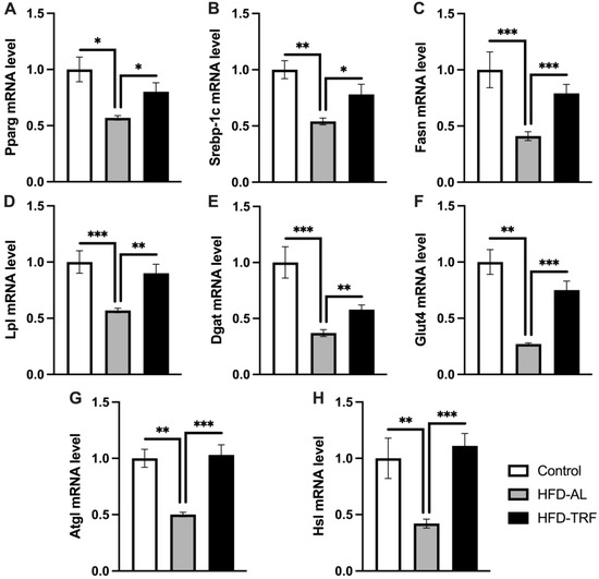 Lipolytic and adipogenic gene expression in epididymal white adipose tissue. (A–H) mRNA expression of genes involved in adipogenesis/lipogenesis and lipolysis in epididymal white adipose tissue of control, HFD-AL and HFD-TRF mice. The data are represented as mean +/− SEM. * p < 0.05; ** p < 0.01; *** p < 0.001.