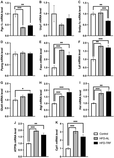 Lipolytic and adipogenic gene expression in inguinal white adipose tissue. (A–K) mRNA expression of genes involved in thermogenesis, adipogenesis/lipogenesis and lipolysis in inguinal white adipose tissue of control, HFD-AL and HFD-TRF mice. The data are represented as mean +/− SEM. * p < 0.05; ** p < 0.01; *** p < 0.001.