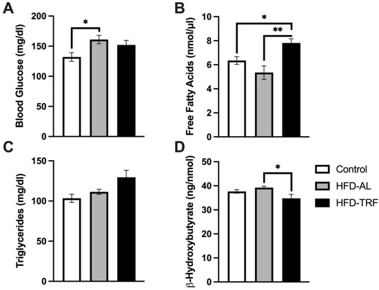 To determine how TRF alters systemic glucose and lipid metabolism, serum was collected from three groups of mice after overnight fasting and analyzed for lipid levels. Blood glucose levels were analyzed via Glucometer prior to the mice being sacrificed and serum kits were used to determine the concentration of free fatty acids (FFA), triglycerides, and B-Hydroxybutyrate (Figure 6). The blood glucose level was significantly increased in the HFD group compared to control mice (Figure 6A). There was a slight decreasing trend found in the TRF mice compared with the HFD-AL group, but with no significance (Figure 6A). This decreasing trend leads to a partial restoration of blood glucose levels towards the control group. The TRF mice had significantly increased levels of serum FFA compared to both the control and HFD-AL groups (Figure 6B). There were no significant differences between groups for serum triglycerides, but the trend was increasing for the TRF group (Figure 6C). Lastly, the TRF group had decreased concentration of β-hydroxybutyrate compared to the HFD-AL with statistical significance (Figure 6D). Collectively, these results suggest that TRF partially improves blood glucose control, increases fatty acid release, and decreases serum ketone body levels in obese mice induced by a long-term (28-week) HFD feeding.