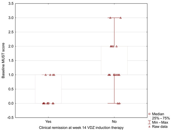 Relationship between the baseline MUST score and clinical remission at week 14 during vedolizumab induction therapy (0.33 ± 0.49 vs. 1.37 ± 0.83; p = 0.002).