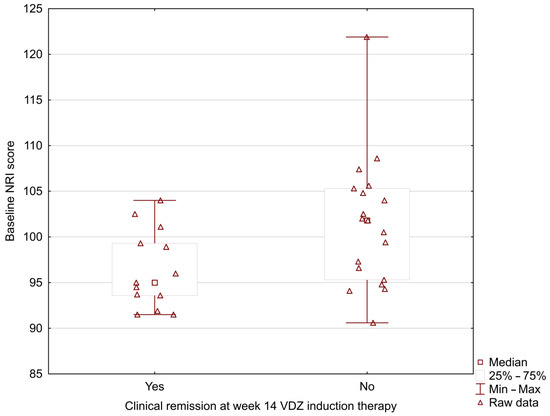 Relationship between the baseline NRI score and clinical remission at week 14 during vedolizumab induction therapy (96.42 ± 4.29 vs. 101.41 ± 7.09; p = 0.024).