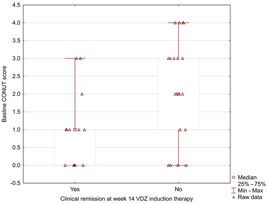 Relationship between the baseline CONUT score and clinical remission at week 14 during vedolizumab induction therapy (CONUT: 1.00 ± 1.08 vs. 2.16 ± 1.46; p = 0.031).