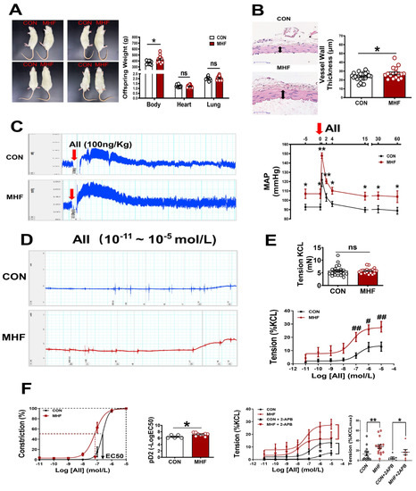 Maternal high-fat diet (MHF) affected offspring weight, blood vessel wall/tension and blood pressure. (A) Comparison of offspring body (N = 9 for CON, N = 15 for MHF), heart (N = 11 for CON, N = 15 for MHF), and lung weight (N = 10 for CON, N = 13 for MHF) between the control (CON) and the MHF group. (B) Thickness of mesenteric artery wall (N = 8 for CON, N = 6 for MHF), Arrows indicate thickness of the vessel wall. (C) Angiotensin II (AII)–mediated pressor responses. Arrow: time of AII injection (N = 5, per group). (D,E) Accumulative AII mediated vascular responses (N = 6 per group, n = 15 for CON, n = 16 for MHF). (F) EC50 and pD2 (n = 5 for CON, n = 9 for MHF), the effect of 2-APB on AII–mediated vasoconstrictions (N = 7, n = 7 per group). MAP, mean arterial pressure; N, number of litters; n, number of MA rings; MA, mesenteric arteries; 2-APB, IP3 inhibitor; ns, no significance; pD2, −log [50% effective concentration (EC50)]. Data were analyzed by Student’s t-test or 2-way ANOVA followed by Bonferroni Posttests. #,* p < 0.05, ##,** p < 0.01.