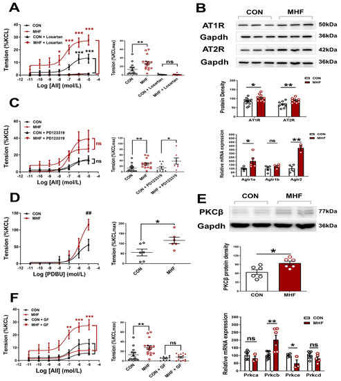 AII-increased vascular tension in the MAs was inhibited completely by Losartan, but not PD123,319, in both the control and MHF offspring. Accumulative concentrations of the PKC agonist PDBU significantly increased MA tension, and the increased levels in the MHF were higher than those of the control. The PKC blocker GF109203X suppressed the AII-increased vascular tension in both the control and MHF, indicating that AII-mediated vascular constriction was mediated via the AT1R-PKC pathway (Figure 2A,C,D,F). Molecular analysis showed mRNA expression of Agtr1a, Agtr2, Prkcb, not Agtr1b, Prkca, Prkce, Prkcd, were significantly higher in the MHF-MAs than in the control. Western blot analysis showed that protein expression levels of AT1R, AT2R, and PKCβ were significantly higher in the MHF-MA (Figure 2B,E and Figures S4–S6).