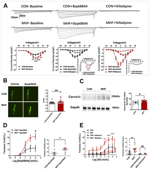 Electrophysiological recording showed that Ca2+ current density was significantly increased in the MHF group. The LTCC channel agonist BayK8644 increased Ca2+ currents in the offspring SMCs in both the control and MHF groups. The increased levels of MHF were higher than those of the control. The LTCC blocker nifedipine almost completely inhibited increased Ca2+ in the SMCs (Figure 3A). Calcium signal analysis showed that fluorescence changes induced by bayk8644 were higher in the SMCs of the MHF-MA than of the control (Figure 3B). Protein expression of Cav1.2 (a major unit of LTCC) was higher in the MHF (Figure 3C and Figure S7). Accumulative BayK8644-increased vessel tension was significantly higher in the MHF-MA. Nifedipine suppressed AII-increased vessel tone in the MAs of offspring in both groups (Figure 3D,E).