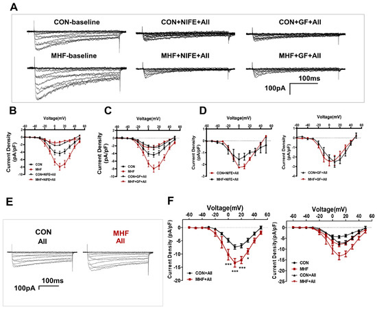 Patch clamp tests showed that AII-increased Ca2+ currents were inhibited by bothGF109203X and nifedipine in the MA-SMCs in both the control and MHF groups (Figure 5A–D). AII-mediated Ca2+ currents were higher in MHF group than that of the control (Figure 5E,F).