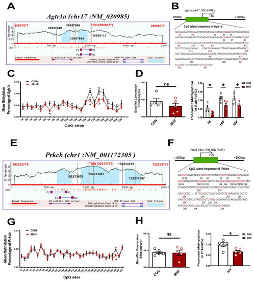 Sequence analysis identified two consecutive CpG islands that contain 23 CpG sites near the Agtr1a gene promoter (product location from 35957866 to 35958112, length 247; and from 35957640 to 35957884, length 245, chr17: NM_030985) (Figure 6A,B), and 32 CpG sites close to the Prkcb gene promoter (product location from 192233659 to 192233847, length 189; and from 192234218 to 192234387, length 170, chr1: NM_001172305) (Figure 6E,F). The bisulfate conversion efficiency of each sample was higher than 99%, indicating that the conversion was efficient and reliable (Figure 6D,H). Bisulfate sequencing showed that methylation levels in the MHF-MA were decreased in three and one specific CpG sites (7#,16#,18# in Agtr1a gene promoter; 30# in Prkcb gene promoter, Figure 6C,D,G,H). Supplementary Tables S1 and S2 show detailed sites and methylation levels of each CpG island.