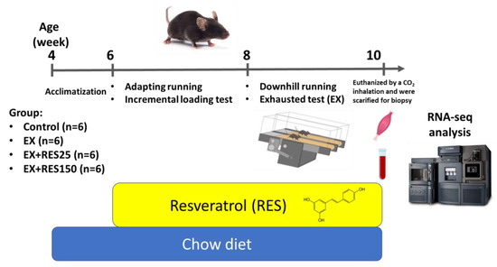 C57BL/6J mice were housed in the animal facility for 1 week for them to adapt to the environment before the study. Twenty-four mice were randomly assigned into four equal groups: control (NC), exercise (EX), exercise with low-dose resveratrol (25 mg/kg body weight; EX + RES25), and exercise with high-dose resveratrol (150 mg/kg body weight; EX + RES150). The mice in the EX, EX + RES25, and EX + RES150 groups underwent 3 days of acclimation running before undertaking the incremental load test (ILT). Acclimation involved running 10 m/min for 15 min with an incline of 0° each day for 3 days. All the mice underwent an exhaustion test the day after the ILT, and the downhill running section of the study started the following week. Resveratrol was dissolved in distilled water. EX-treated mice were gavaged with various amounts (25 mg/kg/d [RES25] and 150 mg/kg/d [RES150] in 0.5 mL of normal saline) of resveratrol or the vehicle (0.5 mL of normal saline) for C and EX groups for 4 weeks (Figure 1).