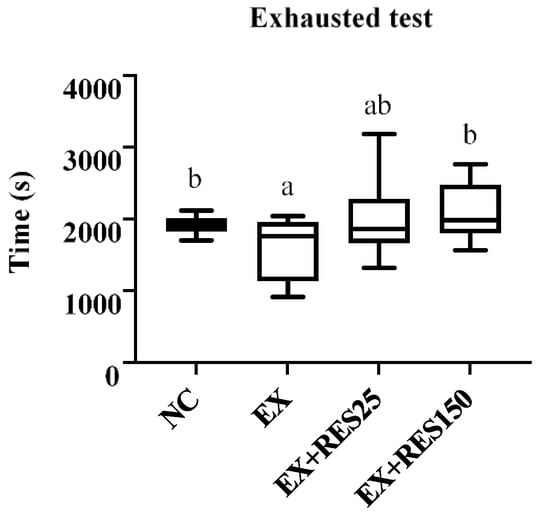 Exhaustion test in different groups. NC: control (n = 6); EX: exercise (n = 6); EX + RES25: exercise with resveratrol 25 mg/kg (n = 6); EX + RES150: exercise with resveratrol 150 mg/kg (n = 6). Data are presented as mean ± SEM. Data were analysed using one-way analysis of variance and a t-test followed by the Bonferroni multiple comparison test. Superscript letters (a and b) in columns denote a significant difference (p < 0.05).