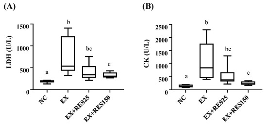 The blood biochemical values of the mice after the exhaustion test showed that the levels of LDH and CK in the EX group were significantly higher than those in the NC group (p < 0.05). Compared with the NC group, LDH and CK in the EX + RES25 and EX + RES150 groups were also significantly increased (p < 0.05 for both), but LDH and CK in the EX + RES150 group were significantly lower than those in the EX group (p < 0.05; Figure 3).