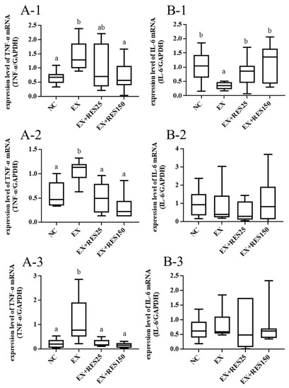 Compared with the NC group, the mRNA expression of TNF-α and IL-6 in the tibialis anterior muscle were significantly higher in the EX, EX + RES25, and EX + RES150 groups (p < 0.05; Figure 4A-2,B-2). Tnfα mRNA expression in the EX + RES25 and EX + RES150 groups was significantly higher than that in the NC group (p < 0.05; Figure 4A-2). The mRNA expression of TNF-α in the EX + RES25 and EX + RES150 groups was significantly lower than that in the EX group (Figure 4A-2). No difference in Il6 mRNA expression among the four groups was found (Figure 4B-2).