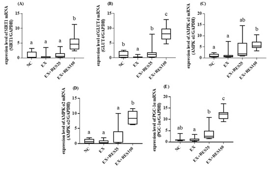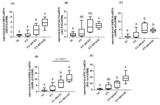 The results showed that the mRNA expression of SIRT1, AMPK α1, and AMPK α2 in the gastrocnemius muscle in the EX + RES25 group was significantly higher than that in the EX group (p < 0.05; Figure 5A,C,D). The mRNA expression levels of GLUT4, AMPK α1, and PGC-1α in the gastrocnemius muscle in the EX + RES150 group were significantly higher than those in the EX group (p < 0.05; Figure 5B,C,E). The mRNA expression of SIRT1 and PGC-1α significantly differed between the EX + RES25 and EX + RES150 groups (p < 0.05; Figure 5A,E).
