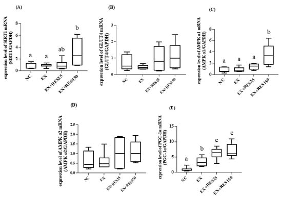 The mRNA expression levels of SIRT1 and AMPK α1 in the tibialis anterior muscle in the EX + RES150 group were significantly higher compared with those in the NC and EX groups (p < 0.05; Figure 6A,C). The mRNA expression of AMPK α1 increased significantly with resveratrol dosage, exhibiting a dose-dependent effect in the two RES groups (p < 0.05; Figure 6C). The mRNA expression of PGC-1α was significantly higher in the EX, EX + RES25, and EX + RES150 groups than in the NC group (p < 0.05; Figure 6E). No difference between the groups in the expression of GLUT4 and AMPK α2 was found (Figure 6B,D).