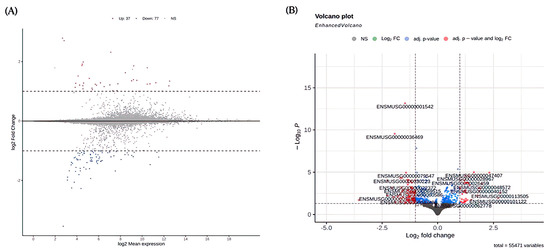 Different gene expression in EX + RES150 and EX groups. (A) MA plot illustrating the distribution of upregulated and downregulated genes (coloured dots) for EX + RES150 group vs. EX group; (B) volcano plot illustrating significance and fold change of the up and downregulated genes (coloured dots) for EX + RES150 group vs. EX group.