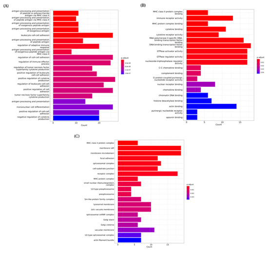 As shown in the biological process plot, pathway regulation occurred due to the intervention of high-dose resveratrol, such as the positive regulation of cytokine production (Figure 9A). Analysis of molecular function showed that the regulation of pathways related to energy hydrolysis enzymes also occurred, indicated, for example, by nucleoside-triphosphatase regulator activity and GTPase regulator activity (Figure 9B). In addition, as shown by the cellular component bar chart, most regulated pathways were found to be related to immunity, such as MHC class II proteins or lysosomal membrane proteins (Figure 9C). Higher doses of resveratrol have a greater effect on facial features during exercise and may have greater anti-inflammatory, energy utilisation-related, and immune-boosting effects.