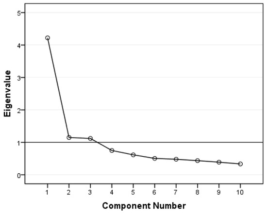 The EEQ was analysed by principal component factor analysis (PCA) with varimax rotation and Kaiser normalization. The overall Kaiser–Meyer–Olkin measure of sampling adequacy was 0.85. Bartlett’s test for sphericity produced a significant result (p < 0.001), indicating that the correlations between items were sufficiently large for PCA. Hence, our preliminary analyses confirmed the appropriateness of PCA for the data. Three factors had eigenvalues over Kaiser’s criterion of 1 (Figure 1). The three factors explained 64.9% of the overall variance. Using the threshold of 0.4 for factor loadings, the items that were clustered in the same components suggest that Factor 1, which includes questions 4, 5, 6, 8, 9, and 10, represents disinhibition, explaining 28.7% of the variance. Factor 2, which includes questions 2, 3, and 4 represents the type of food, and explains 20.1% of the variance. Factor 3, which includes questions 1 and 7, represents guilt and explains 16.1% of the variance. Factor loading after rotation of each item is shown in Table 2.