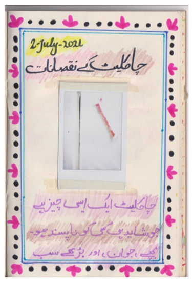 Participants photographed and wrote about the most available and consumed foods and beverages. Qirat mentioned that she had to rely on her brothers to bring her the food she wanted to capture, but by the time they brought the desired item, she had already completed her photodiary. Jannat photographed a plate containing six onions and wrote in her diary: “it [onion] is an important vegetable that is consumed in our daily life. Onions are used in Subcontinent, Pakistan and India, and all over the world”. Participants displayed pictures of their favourite food items, acknowledging either the good or bad effects on health. Ashi wrote in her diary a poem about the mango—also known as “the king of fruits” among the participants—which she copied from YouTube. On another page of her photodiary, she pasted a picture of a chocolate bar, indicating its general likeability without forgetting its unhealthiness (Figure 2).