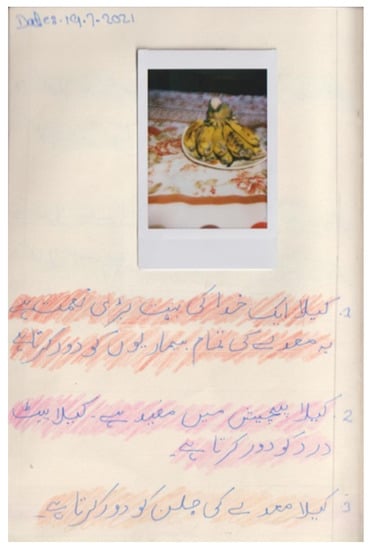 Jannat’s photodiary: “banana is a blessing of God, it can treat all stomach related issues. It is also helpful in dysentery. It cures stomach pain. It treats stomach acidity. [continues on another page, not shown] It cures dyspepsia and nausea. It is also beneficial in heartburn, and it also increases immunity”.