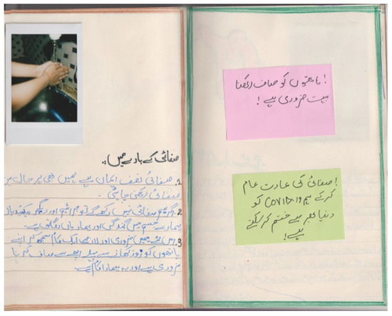 Throughout the photodiaries and interviews, all participants indicated numerous pieces of advice to be healthy (like them). Alcohol, drugs, tobacco, smokeless tobacco, fried food, non-homemade food, soft drinks, and bad influences should be certainly avoided. They suggested doing exercise and gave guidance on the frequency of consumption of some items; for instance, eating five pieces of fruit and vegetables a day, drinking one glass of milk daily, consuming chicken once per weak maximum, drinking 12 glasses of water per day, and eating an apple, banana, pomegranate or tomato every day. Many participants commented that foods high in micronutrients should be consumed because they delay ageing, allow fast illness recovery, and “prevent our body from becoming weak” (Qirat). Mary used a metaphor to explain that our body has a “syllabus” of micronutrients that we should aim to “maintain”. Participants also gave some hygiene recommendations, such as keeping the kitchen clean, washing fruits and vegetables before consuming, and washing hands before cooking or eating. Some participants highlighted that these recommendations were critical now to stop COVID-19 (Figure 6):