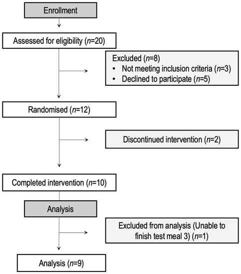 Twelve healthy older men and women were recruited to participate in the study through poster and e-mail advertisements. A Consolidation Standards of Reporting Trials (CONSORT) diagram showing the progress from recruitment through the completion of the study is shown in Figure 1. Two participants dropped out during the study due to personal reasons and were therefore excluded from the analysis. A third participant could not finish test meal 3, consuming only 50% of the meal, and was therefore excluded from the analysis. Inclusion criteria were: 65 years of age or older, non-heavy smokers (<10 cigarettes per day) or heavy drinkers (<14 or 21 alcoholic drinks per week in females or males, respectively), and otherwise healthy, according to responses to a standard medical screening questionnaire. Exclusion criteria included self-reported diabetes mellitus, prediabetes, cardiovascular disease, renal disease, gastrointestinal (GI) disease, chronic obstructive pulmonary disease, significant body mass loss in the six months preceding the study, medical condition or use of medication known to impact appetite or energy intake, loss of taste or smell associated with COVID-19, and allergic or unwilling to consume study foods.