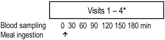 Overview of study design. Each participant underwent four visits (* between one to three weeks apart). The meals were allocated randomly (containing WPF or PPF 1–3). Each PPF product included a blend of plant protein sources and 20% pea fibre. Pea fibre (10 g) was also added to the whey-containing meal. PPF, plant protein fibre; WPF, whey protein fibre.