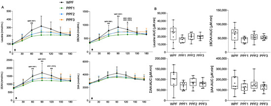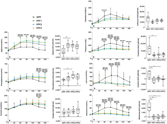 Arginine, tyrosine, and phenylalanine displayed lower postprandial availability following WPF ingestion than PPF products (Figure 4). While arginine’s postprandial concentration curve was significantly lower at all time points after 30 min, tyrosine and phenylalanine postprandial concentration curves had similar Cmax for all test meals. Yet, after PPF, these concentrations were more sustained, creating a significant difference at the latest time points (150 and 180 min). All three AA were present at higher concentrations in the PPF- vs. the WPF-containing meal (Table 2), which could explain (part of) the observed differences, especially for arginine.